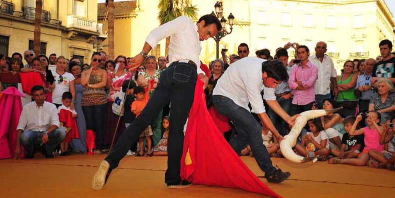 El diestro sevillano Manuel Jesús ‘El Cid’ ha protagonizado esta tarde en la capital onubense una demostración de toreo de salón en pleno centro de Huelva: la plaza de Las Monjas. El torero, que abre el jueves el ciclo de Colombinas en La Merced, comentó la técnica del toreo con capote y muleta, y ayudó a aficionados a torear de salón.